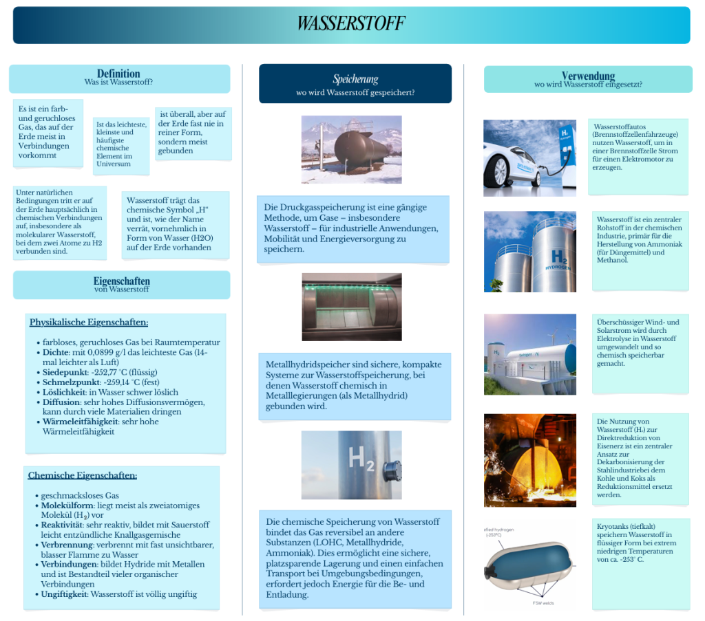 Für diese Seite haben wir eine eigene Grafik zum Thema Wasserstoff erstellt, um das Thema übersichtlich und verständlich darzustellen. Dabei werden die wichtigsten Grundlagen, Eigenschaften sowie die Speicherung und Verwendung von Wasserstoff kompakt zusammengefasst.